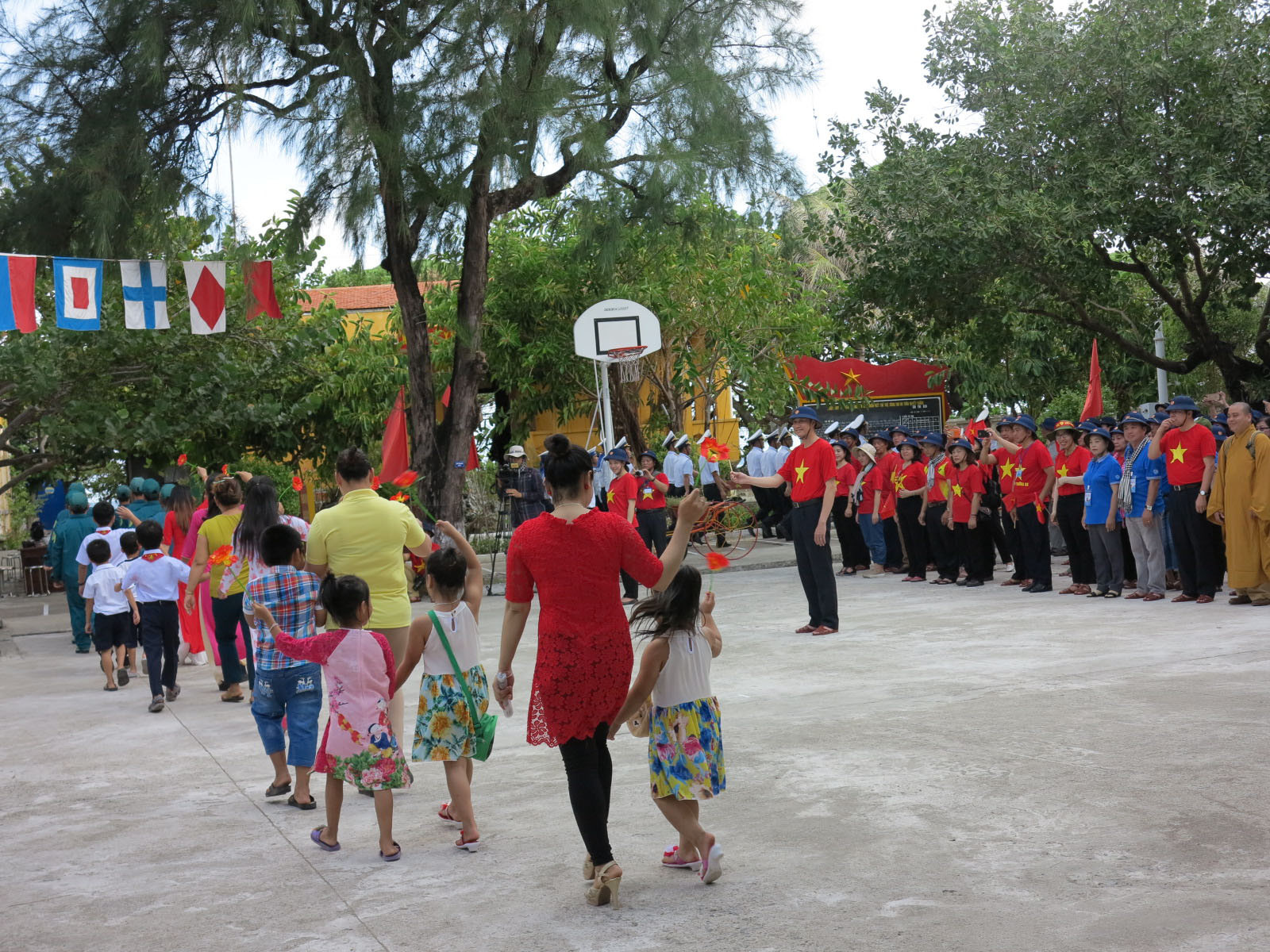Người dân và các em thiếu nhi trên đảo Sinh Tồn vui vẻ tham dự Lễ chào cờ và diễu hành quanh đảo.