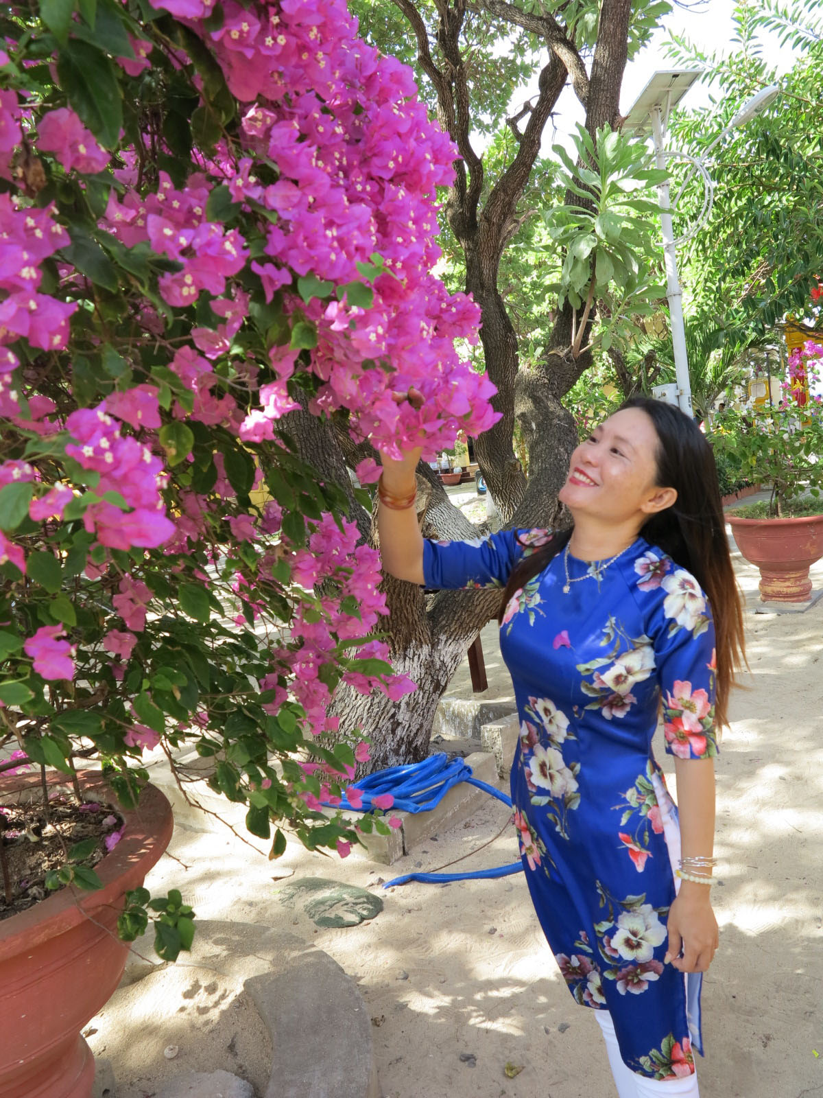 Cô Trần Thị Kim Loan (cư dân trên đảo Sinh Tồn) tạo dáng trước cây hoa giấy nở bung sắc đỏ trong nắng gió biển khơi.