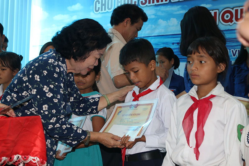 Chủ nhiệm CLB “Vì Hoàng Sa – Trường Sa thân yêu”) tận tay trao những suất học bổng Vừ A Dính cho các em học sinh.